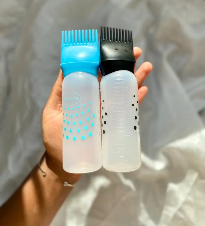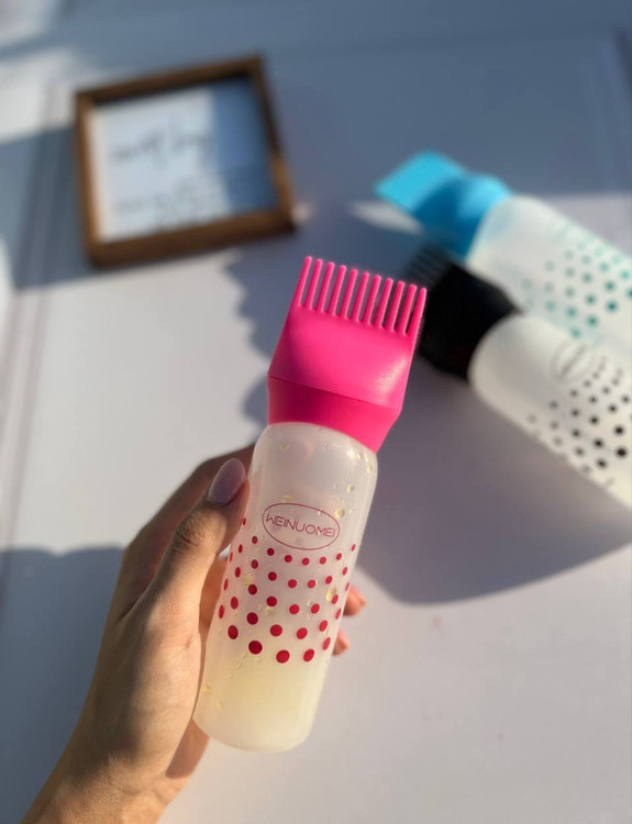 - این بطری بخاطر داشتن اپلایکاتور شانه ای بصورت خطی و مستقیم همزمان با شانه کشیدن مو، روغن را به کف سر میرساند